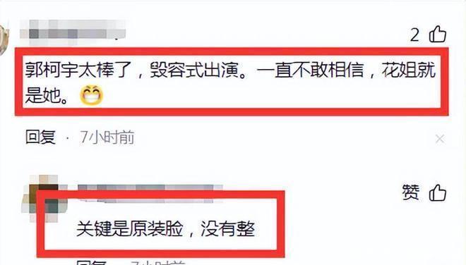 有网友说,“郭柯宇太棒了,毁容式出演,一直不敢肯定,花姐便是她,关节是原装脸莫得整”。